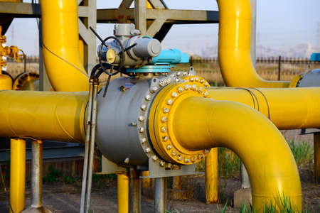 Yellow gas pipe with a tap. Oil pipeline fittings in the oil and gas industry. Oil and gas processing plant with pipeline fittings. Industrial safety valve