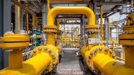 Bright yellow pipes and valves in a gas plant, showcasing the intricate control system essential for industrial gas processing.