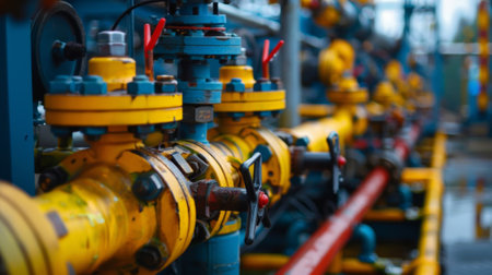 A detailed close-up of industrial valve assembly showcasing vibrant red and yellow pipes. This image captures essential components in the oil and gas sector, emphasizing technology and design.