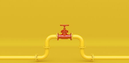 Yellow pipes with a red valve on a yellow background. 3D Render.