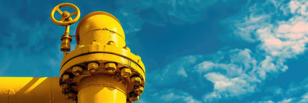 Bright yellow industrial pipes with valves against a colorful sky backdrop. Concept Industrial Photography, Colorful Landscapes, Urban Architecture, Vivid Contrasts, Industrial Design