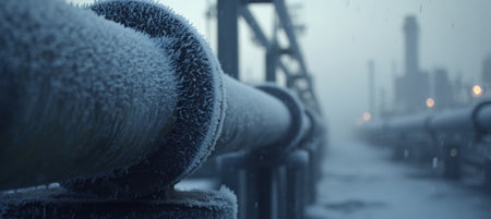 A frosty pipeline network captured in winter conditions, showcasing frost-coated pipes under a cold bluish atmosphere with crisp outdoor lighting in a documentary engineering style.