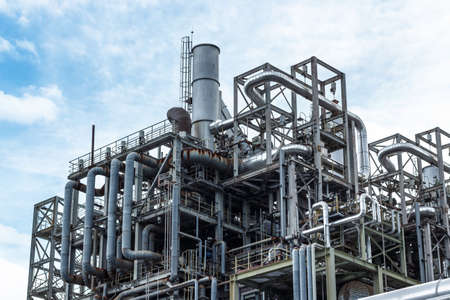 Refinery process area of petrochemical plant on classic blue sky with clouds background.