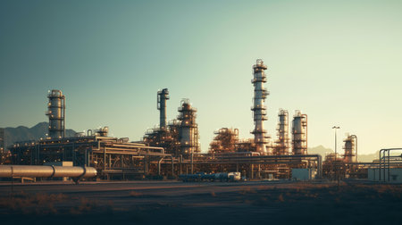 Oil refinery with clear skies and evening sun. Refinery pipelines and chimneys against clear sky. Website or blogpost background.