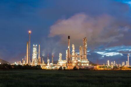 Oil refinery plant at twilight dark blue sky