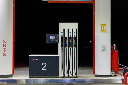 Diesel and gasoline pumps. Gas station for transport. Background with copy space for text or inscriptions. July 25, 2021 Beltsy Moldova.