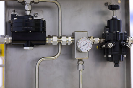 Closeup of pressure manometer measuring gas pressure, industry background, selective focus, pipes and valves in the chemistry laboratory
