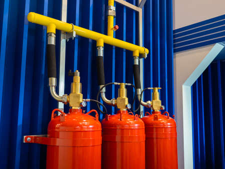 Fire extinguishing system cylinders on blue background. Industrial fire extinguishing system. Concept installation flame extinguishing systems. Fire safety at enterprise. Safety and rescue systems