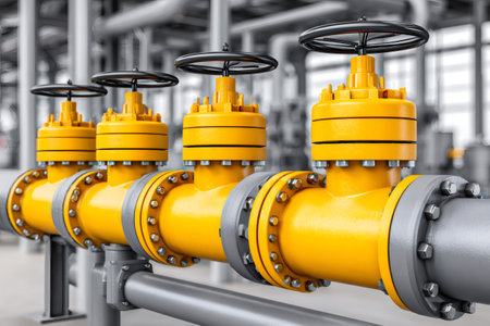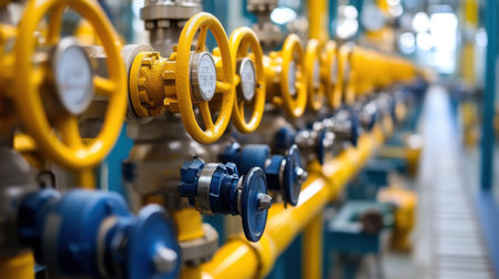 Pipeline carrying natural gas with multiple yellow valves managing flow in an industrial facility