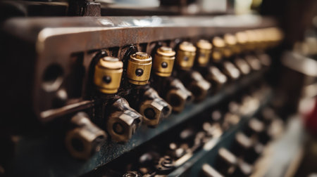 This close-up image captures vintage mechanical equipment, showcasing intricate cogs and valves in a workshop. The design highlights craftsmanship.