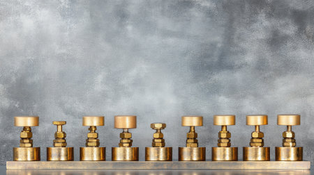This image features a row of vintage precision weights displayed on a shelf. The weights are beautifully crafted in brass, set against a soft gray background, perfect for themes in measurement, science, and history.