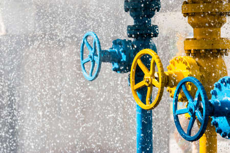 Pipeline valves section close-up. Technological background for the gas, oil or pipe industry.