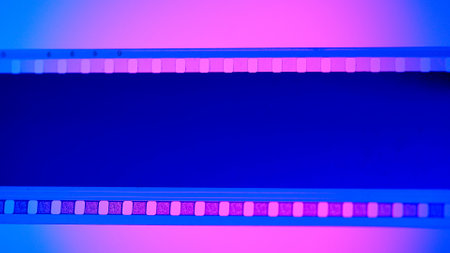 Blank undeveloped strip of film on blue background, illuminated by pink neon light in close up. 35mm film slide frame. Cinema or photo frames. Long, retro film strip frame. Copy space.