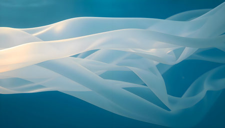 Translucent fabric flows in graceful curves against a gradient sky with sunset light rays.
