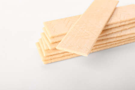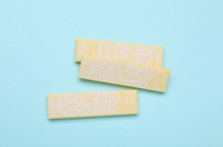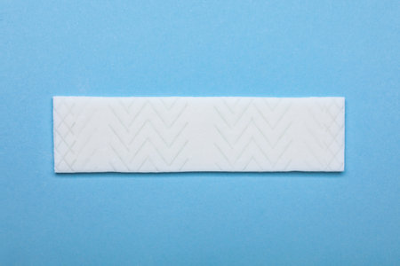 Many sticks of tasty chewing gum on light blue background, flat lay. Space for text