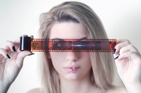 Beautiful young woman holding a processed 35 mm camera film in front of her face