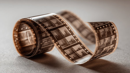 Rolled strip of mm negative film lying on a light table, showing faint image frames in sepia tones