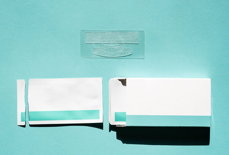 Mock up teeth whitening stripes for home dental care. Set of oral hygiene products.