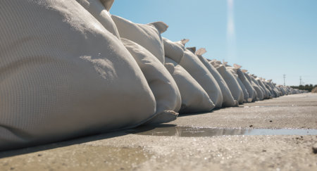 Long row of light grey sandbags aligned on wet ground under a clear blue sky, with sun flare and puddles. represents flood defense, protection, and disaster preparedness.