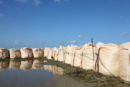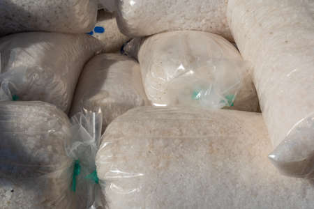 Bags of road salt - white salt sacks rows stacked to prevent ice roads asphalt