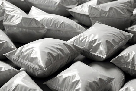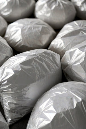 A picture of crumpled polythene packages in different sizes and shapes, set against a dark background for a layered effect.
