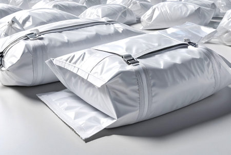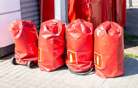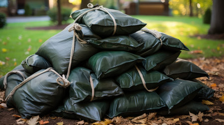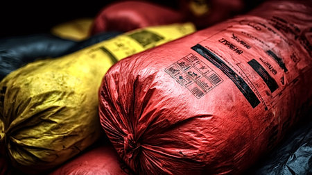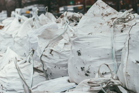 Stacked hazardous waste bags showing warning labels for safe environmental disposal and management, representing industrial cleanup, disaster recovery, and ecological protection efforts