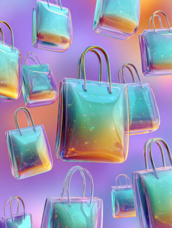 Transparent shopping bags appear to float in a vibrant setting filled with purple and orange colors, creating a whimsical and modern ambiance.