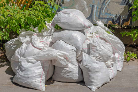 Construction waste. Garbage in the bags after the reconstruction of the apartment. Illegal dumping. Selective focus.