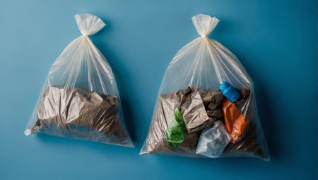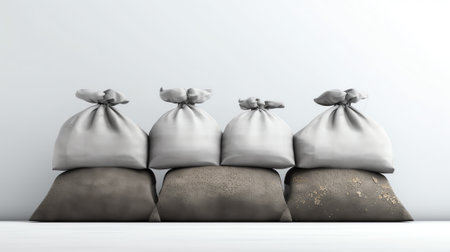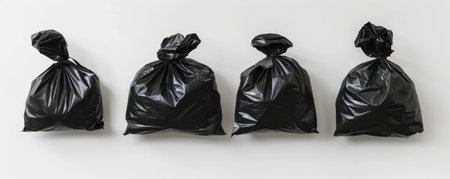 Four tied black garbage bags are neatly lined up against a white background, illustrating waste management and cleanliness in a household or urban setting.