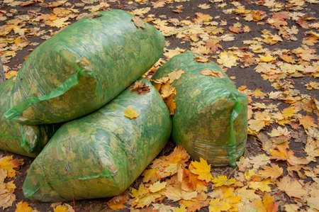 Maple leaves fallen in autumn are collected in a biodegradable bag