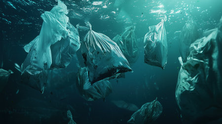 Ocean and nature pollution concept. Plastic bags floating underwater with sun rays shining through. Generative AI