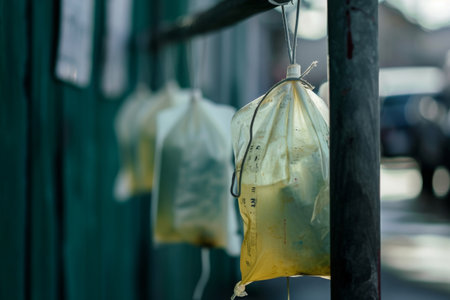 A bag of garbage is hanging from a metal pole in a crowded urban setting, Saline solution bags hanging from a post, AI Generated