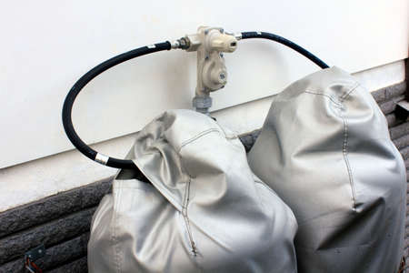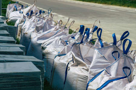 Bags with building materials - sand and gravel, arranged in a row. High quality photo