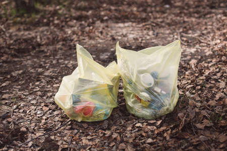 Garbage bags in the forest. The concept of cleaning the park, collecting garbage and caring for the environment