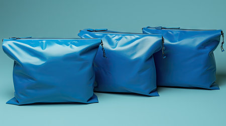 Three vibrant blue bags arranged neatly in a row on the ground.