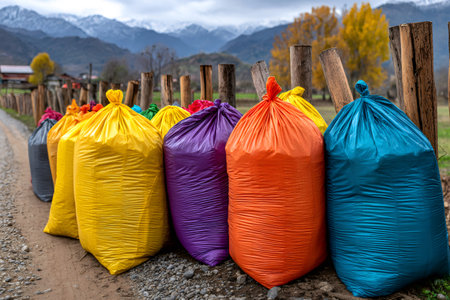 Colorful bags filled with waste placed by a wooden fence for collection or recycling