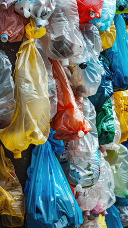 A wall covered in plastic bags of various colors. The bags are hanging from the wall, creating a colorful and chaotic scene. Concept of waste and environmental impact