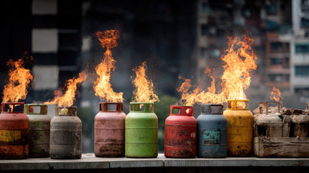 A striking image of colorful gas cylinders with flames erupting from their nozzles, set against an urban backdrop, showcasing the energy and risks of gas handling.