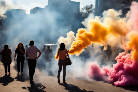 A man wearing a gas mask is standing in front of a cloud of smoke. Concept of danger and urgency, as the man is trying to protect himself from the harmful effects of the smoke