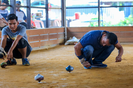 SELANGOR, MALAYSIA - DECEMBER 30, 2018: A group of men playing a traditional game called gasing or tops spinning. Gasing is Malaysia's popular heritage game for tourists in the tourism industry.
