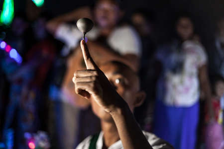 YANGON, MYANMAR DECEMBER 3, 2016 : Street performer in Maha Bandula Park with spinning top performs for crowd at night