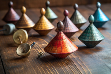 antique spinning tops on a wooden surface, created with generative ai