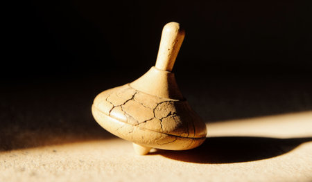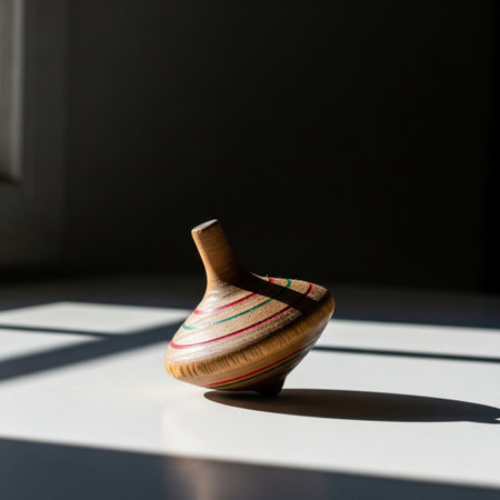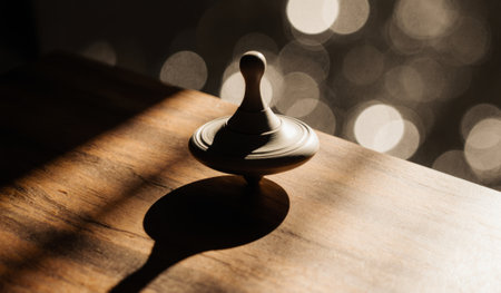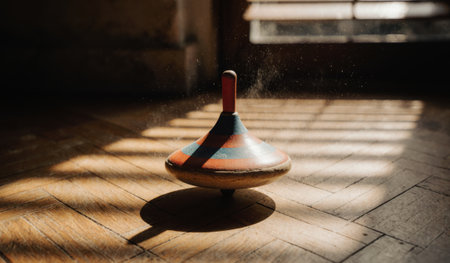 A beautifully handcrafted spinning top spins gently on a wooden table. The warm sunlight filters through, casting intricate shadows as the top dances.