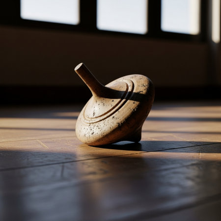 A vibrant spinning top twirls energetically on a sunlit wooden floor, casting playful shadows. Dust particles gently float in the warm light, adding to the nostalgic scene of childhood joy.