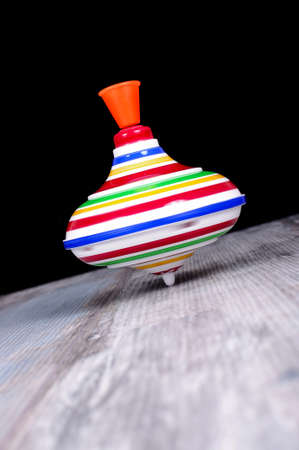 Plastic spinning top toy isolated on the reclaimed oak surface