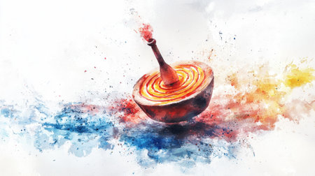 A spinning top rotates at high speed, generating a blur of dynamic colors. The background features an abstract design with splashes of red, blue, and yellow.