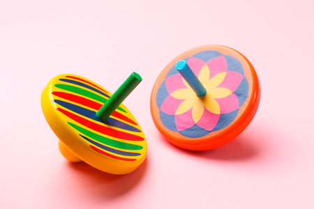 Two colorful spinning tops on pink background, closeup