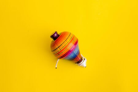 One bright spinning top on yellow background. Toy whirligig