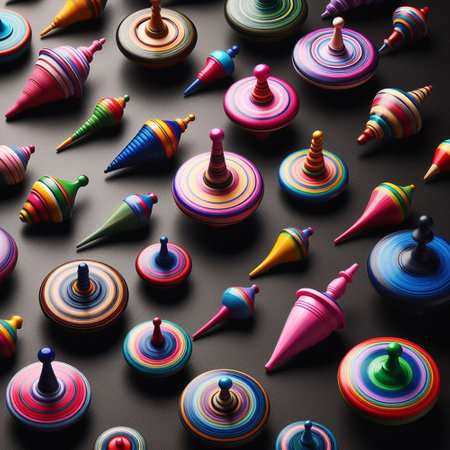 Group of multicolored spinning tops on a dark background. Minimal concept