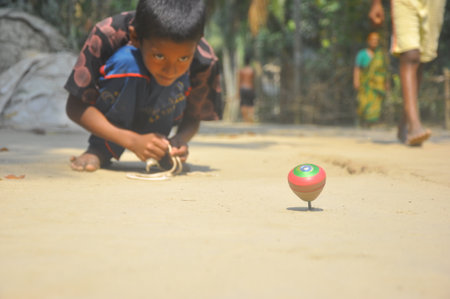 Dhaka, Bangladesh, 20 January 2018: An image of an unidentified boy is playing a rural game in nearby arear of Dhaka, Bangladesh.